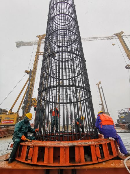 中新網安徽新聞2月7日電 (通訊員趙懿 完顏亮) 2月7日上午,連續十幾個小時大雪后,地上積雪已達到七八厘米厚,中鐵大橋局G3銅陵公鐵長江大橋現場在大雪中大干。3#主墩,5臺旋挖鉆在同時施工,工人們冒著寒冷和大雪在安裝鉆孔樁的鋼筋籠。項目部為工人配發了雨衣、保溫棉服等御寒安全用品,保障安全作業。