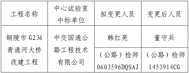 銅陵市G236青通河大橋改建工程中心試驗(yàn)室,于2019年9月29日開標(biāo),中標(biāo)單位為中交國通公路工程技術(shù)有限公司。因原中標(biāo)項(xiàng)目負(fù)責(zé)人個(gè)人家庭原因,無法到崗履行合同責(zé)任與義務(wù),故中交國通公路工程技術(shù)有限公司申請中心試驗(yàn)室項(xiàng)目負(fù)責(zé)人變更。現(xiàn)將項(xiàng)目負(fù)責(zé)人變更情況予以公示,如有異議,請于7日內(nèi)向銅陵市綜合交通投資集團(tuán)有限公司反映。