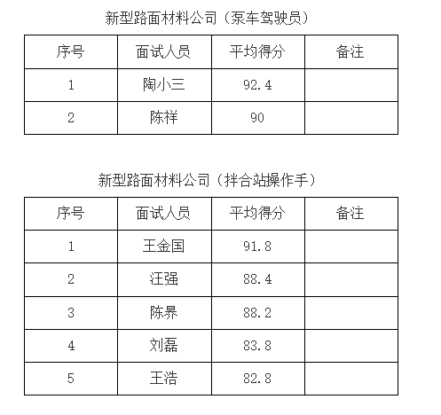根據《銅陵市綜交新型路面材料有限責任公司公開招聘人員公告》,我公司已于2021年9月5日開展銅陵市綜交新型路面材料有限責任公司相關崗位面試工作,現將面試成績公示如下: