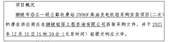 項目名稱:銅陵市沿江一級公路收費站200KW柴油發電機組采購安裝項目(二次)