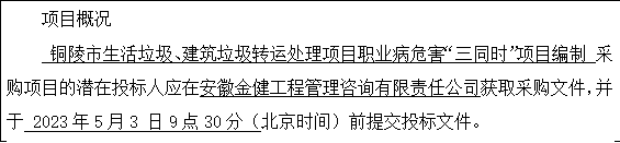 采購需求:銅陵市生活垃圾、建筑垃圾轉運處理項目職業病危害“三同時”項目編制,詳見招標文件項目需求內容。